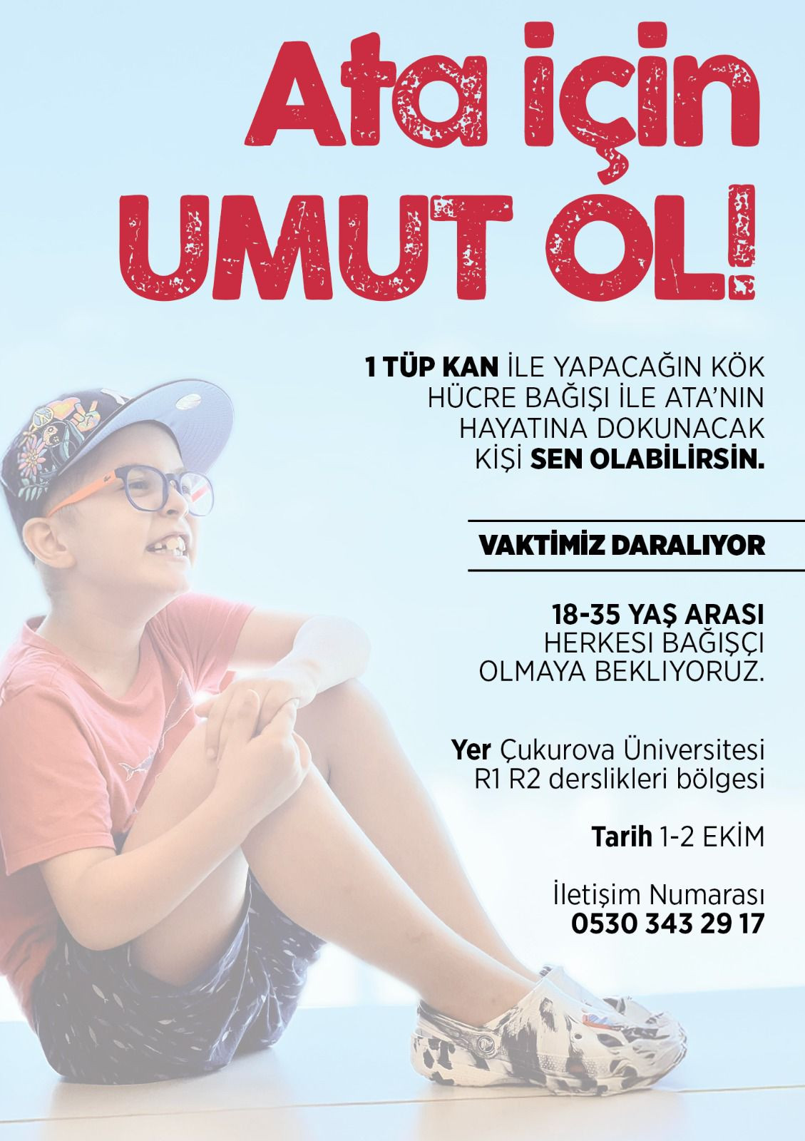 Adana Acıbadem Hastanesinde acil ilik nakli yapılması gereken 10 yaşındaki Ata için henüz uygun bir verici bulunamadı. Tedavi için çok kısa bir süresi kalan hasta için kök hücre bağışçısı olabilmek çok kolay. Sadece bir küçük tüp kan örneği vererek bir hayat kurtarabilirsiniz.